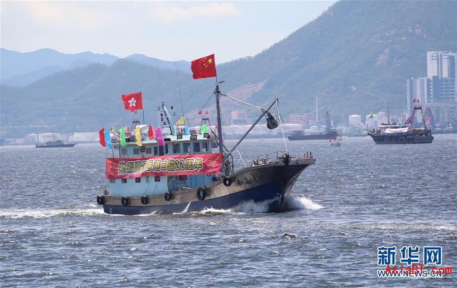 7月1日,香港漁民團體聯會的70艘漁船插滿鮮艷的國旗、區旗和慶祝標語,在維多利亞港巡游,慶祝香港回歸祖國22周年。